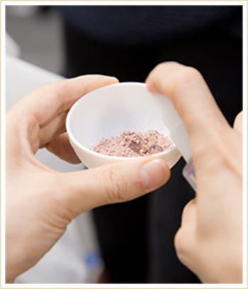 いよいよメイン工程のパウダー入れ込み施術。まずは顔全体にパウダーをまんべんなく塗布し、次に手のひら全体を使いパウダーを浸透させていきます。技術者の経験とテクニックが要求される部分です。